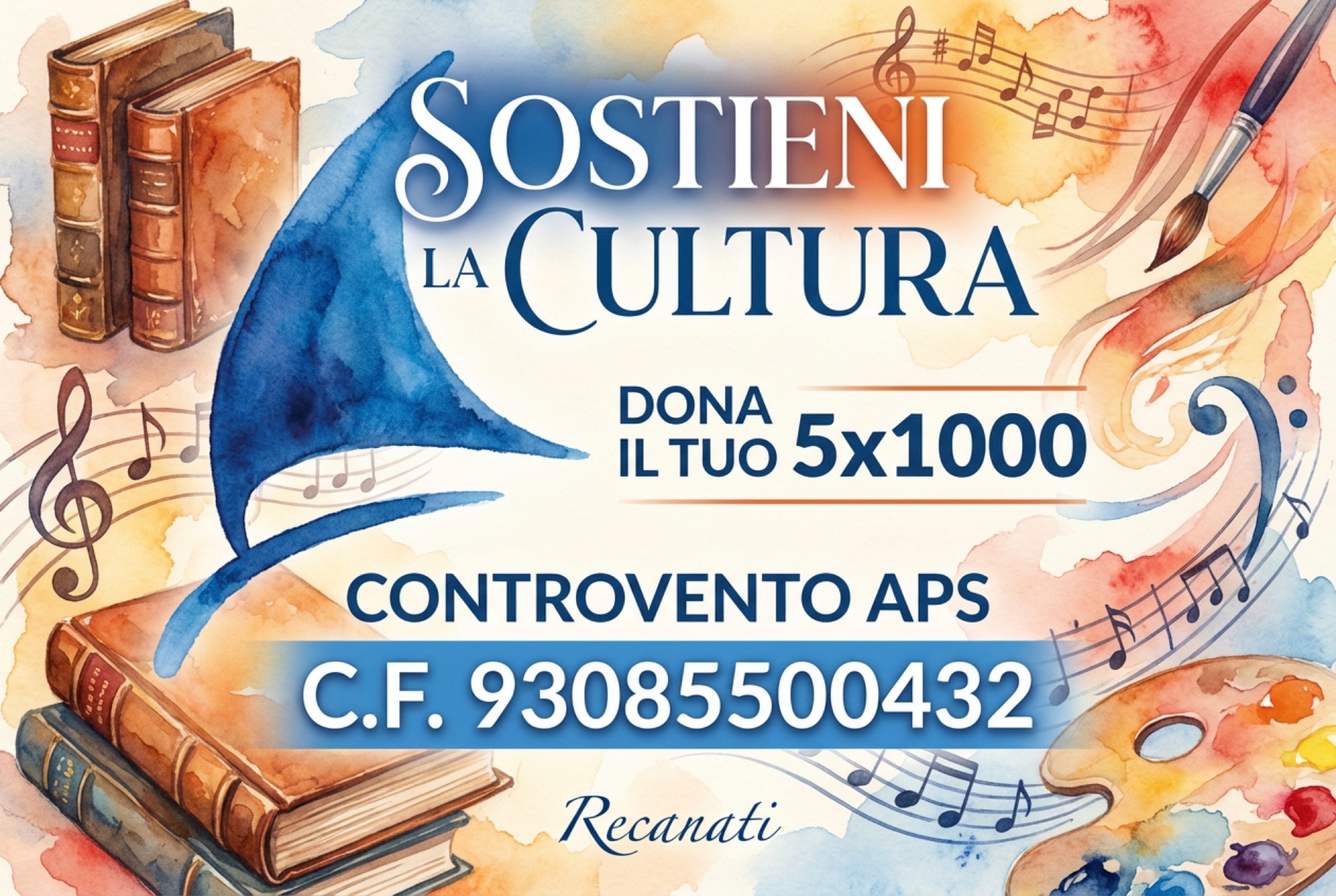 Dona il tuo 5x1000 - Un gesto semplice e gratuito che per noi è vitale. Nella tua dichiarazione dei redditi, firma nel riquadro dedicato agli Enti del Terzo Settore (APS) e inserisci il nostro Codice Fiscale. Trasformeremo la tua quota in eventi culturali, acquisto di nuovi volumi per la biblioteca e progetti sociali sul territorio.
